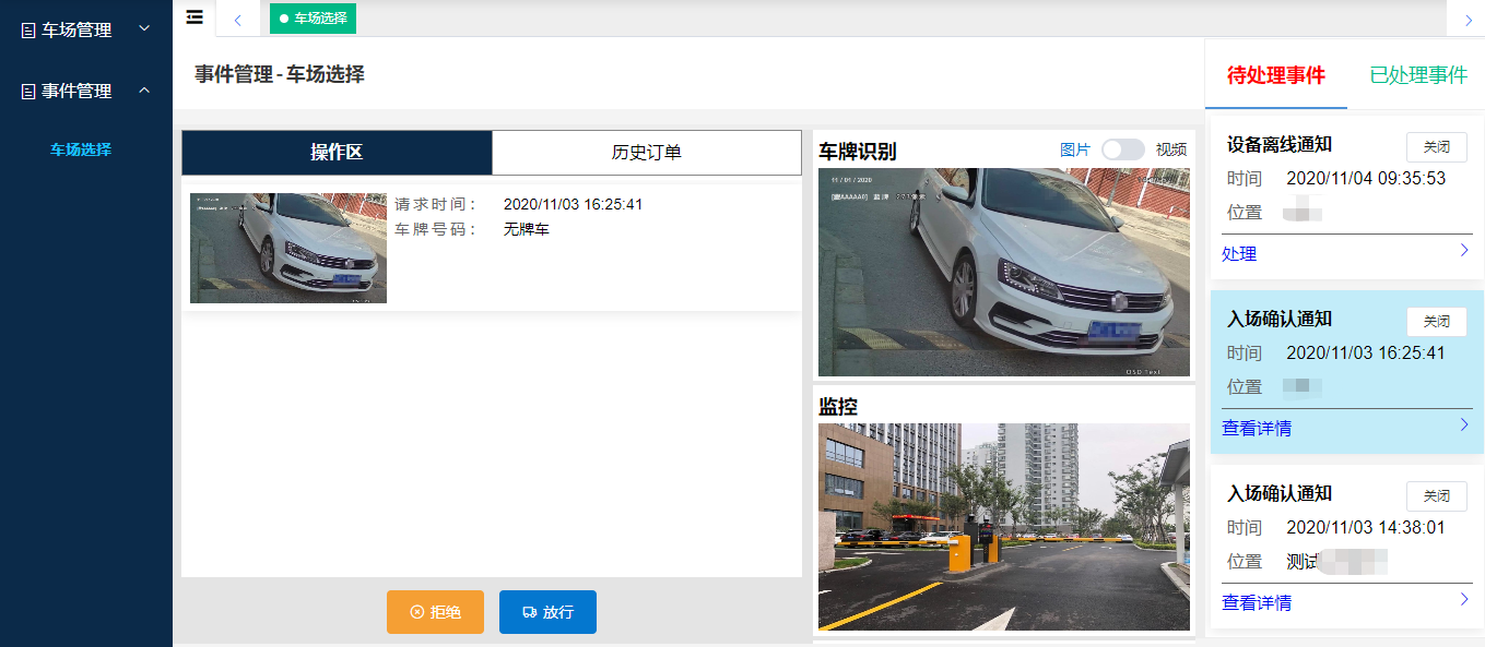 云平臺(tái)可統(tǒng)一處理多個(gè)車場(chǎng)的現(xiàn)場(chǎng)異常情況,例如無牌車入場(chǎng)確認(rèn)申請(qǐng)、語音呼叫等事宜。