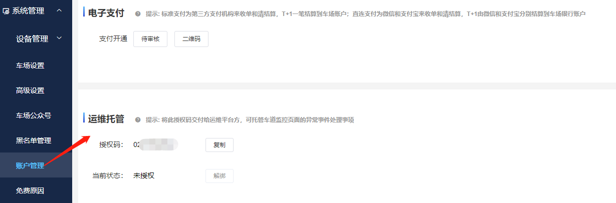 車場(chǎng)登錄云平臺(tái),系統(tǒng)管理模塊的賬戶管理頁面,復(fù)制授權(quán)碼交于運(yùn)維平臺(tái)方綁定,即可托管車場(chǎng)異常時(shí)間處理事宜。