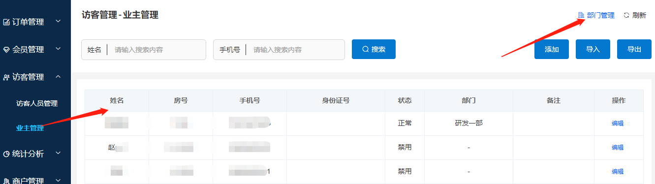 車(chē)場(chǎng)可添加或?qū)霕I(yè)主信息(手機(jī)號(hào)唯一),狀態(tài)“正?!焙汀敖谩睂?duì)應(yīng)訪客管理的“認(rèn)證”和“非認(rèn)證”。