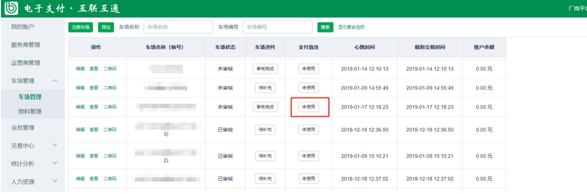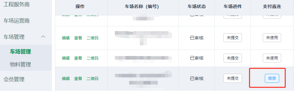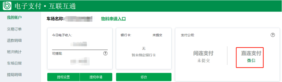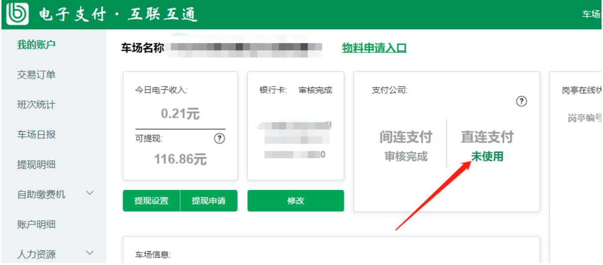 3、車場信息填寫正確,走正常的開通直連流程,車場可以在支付直連入口的“開通狀態(tài)”查看當(dāng)前進(jìn)展,如果是開通中的狀態(tài)的時(shí)候是不允許編輯修改的。