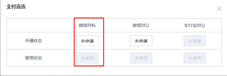 登錄泊鏈后臺(tái)可以點(diǎn)擊直連支付的狀態(tài)“未使用”,進(jìn)行下一步的申請(qǐng)操作。
