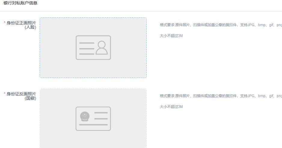 注意:銀行對(duì)私賬戶信息 這里上傳的身份證照片和填寫的開戶銀行,開戶城市,開戶人姓名,開戶人證件號(hào)和銀行賬號(hào)的信息一定要一致。