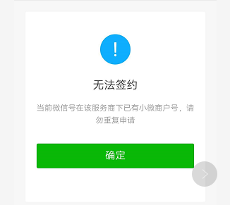 2.若進(jìn)件的賬戶的微信已經(jīng)開通過小微商戶,如再次進(jìn)行申請(qǐng)小微商戶時(shí)掃碼簽約時(shí)失敗,請(qǐng)更換進(jìn)件賬戶信息。