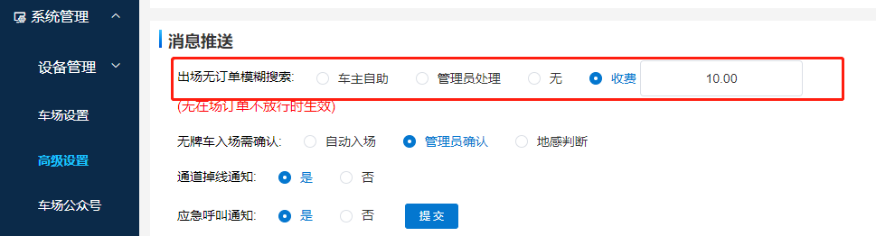 當(dāng)車場設(shè)置出口無訂單不放行時(shí),可在高級(jí)設(shè)置里打開“收費(fèi)”功能,并設(shè)置收費(fèi)金額(支持 兩位 小數(shù)),這樣出口未匹配到在場訂單時(shí)會(huì)提示車主掃通道碼支付,返回給車主一個(gè)無牌車的訂單,以及設(shè)置的該金額,支付后會(huì)放行。