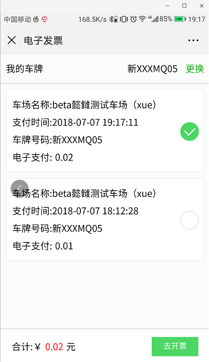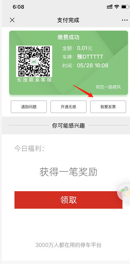 注:支付寶支付的完成頁不能開票,可以通過微信搜索“智慧停車云”公眾號開票