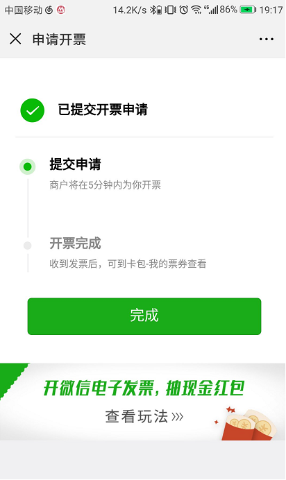開票申請?zhí)峤怀晒Γ_票完成后可收到開票提醒的服務(wù)通知,在微信卡包、我的票券查看發(fā)票。