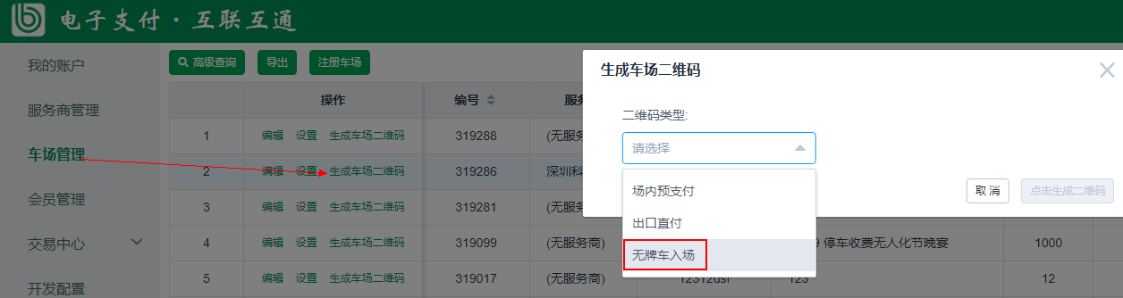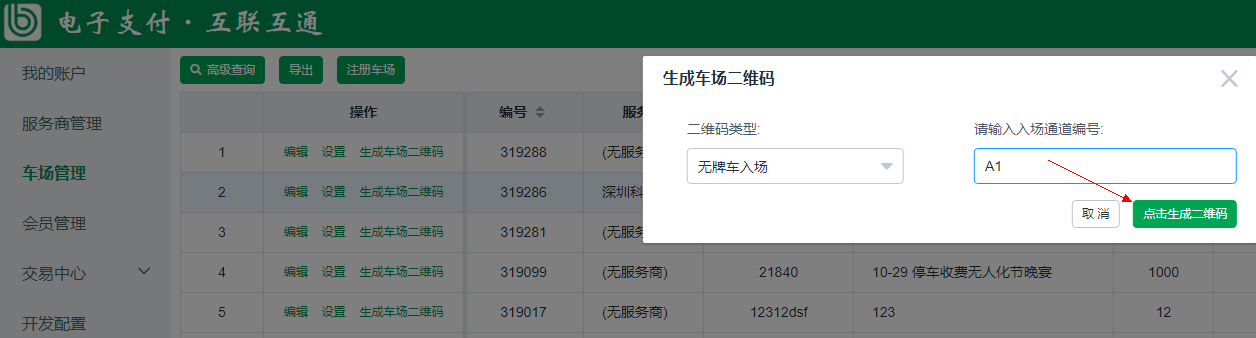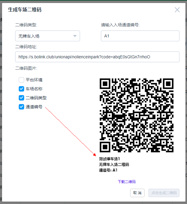 1、廠商平臺管理員登錄本廠商的泊鏈后臺,選擇車場管理模塊,在需要生成場內(nèi)預(yù)付碼的車場點(diǎn)擊“生成車場二維碼”,二維碼類型選擇“無牌車入場”,輸入入場通道編號,點(diǎn)擊生成二維碼,即可生成對應(yīng)二維碼??晒催x該圖片下方的標(biāo)記項(xiàng)、可下載圖片、可復(fù)制二維碼地址。