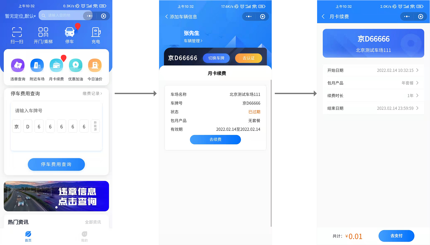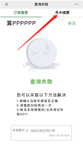 [2 ] 車(chē)主掃描車(chē)場(chǎng)預(yù)付二維碼,手機(jī)頁(yè)面會(huì)有月卡續(xù)費(fèi)入口,查詢(xún)當(dāng)前輸入的車(chē)牌的月卡信息,續(xù)費(fèi)操作同公眾號(hào)。