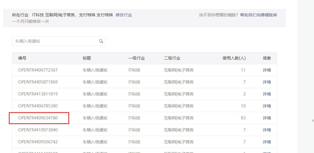 同樣搜索 車(chē)輛出場(chǎng)通知 找到編號(hào)是 OPENTM412323361 同樣添加,獲取出場(chǎng)模板ID。