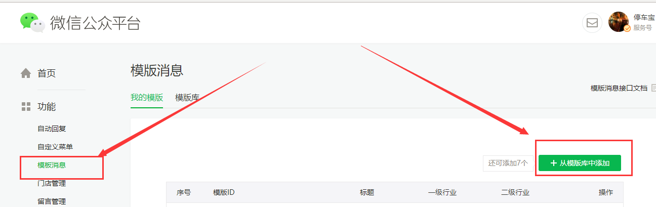 添加完成后會(huì)回到第一個(gè)頁(yè)面,這時(shí)找到新加的模板消息,獲取入場(chǎng)模板ID。