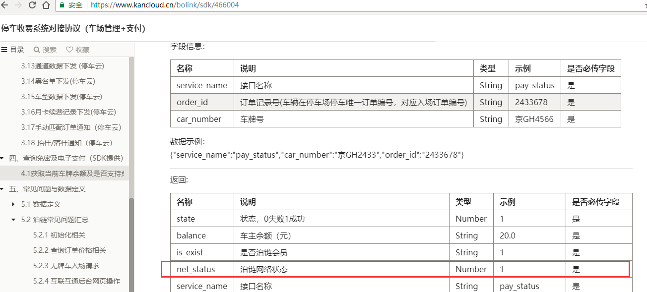 2、判斷方法:調(diào)用SDK的4.1接口,傳任意訂單號和車牌號(可以不是真實(shí)存在的,比如001),返回字段中會帶截圖中的網(wǎng)絡(luò)狀態(tài)。