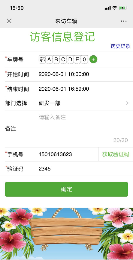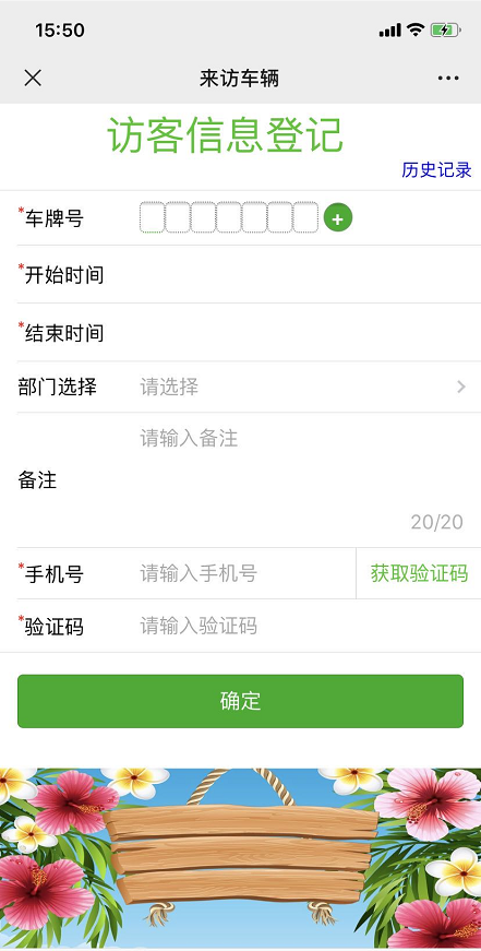 車場來訪人員手機掃描訪客二維碼(微信、支付寶),打開的網(wǎng)頁內(nèi)輸入來訪車輛的車牌信息、來訪的起止時間等信息,提交即可。(注:微信可查看訪客申請的歷史記錄)