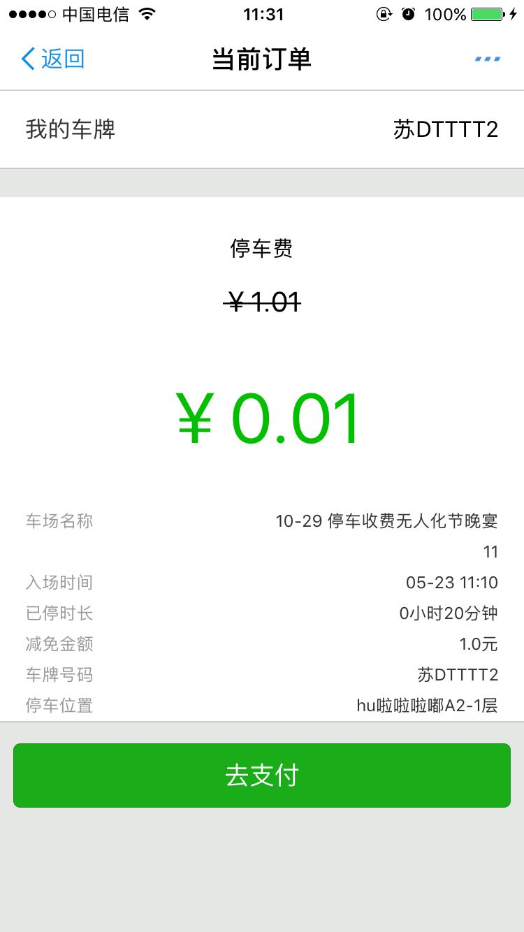 上圖所示,綠色數值為當前應收金額,是減免之后還需支付的金額,車主可當前預付也可出場時支付。