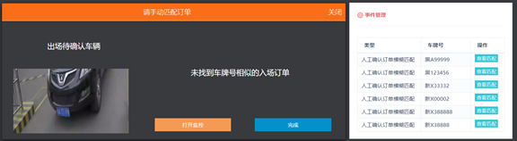 車輛出場時,車牌識別錯誤,沒有精確匹配到訂單。收費系統(tǒng)調(diào)用接口2.17上傳該車牌信息到云平臺,并調(diào)用接口2.12上傳該車輛的圖片(picture_source為confirm),云平臺查詢匹配進場訂單,在中央監(jiān)控頁面展示該事件,管理員查看事件,比對該車圖片與匹配出的車輛圖片,選出對應(yīng)車輛,之后調(diào)用接口3.17下發(fā)匹配訂單信息給車場,車場收到該訂單予以結(jié)算放行。(注:事件未上傳圖片時,中央監(jiān)控頁面不予顯示)