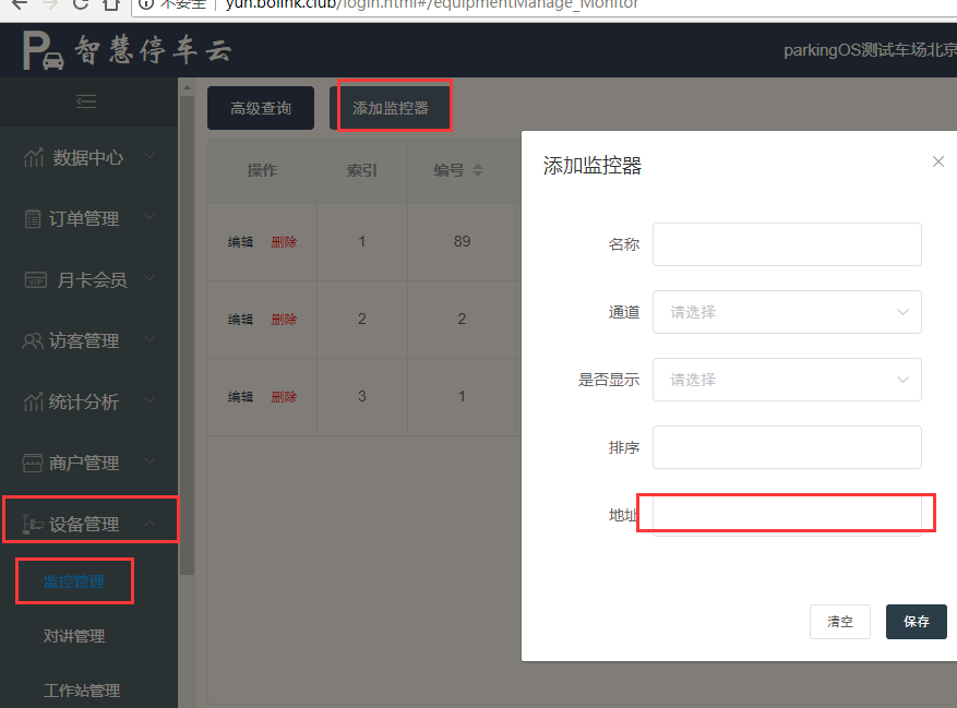 在車場的設(shè)備管理模塊,可以添加監(jiān)控,輸入監(jiān)控的名稱、監(jiān)控地址等信息。添加監(jiān)控時可綁定指定的通道,在中控室就可以打開該監(jiān)控進行抬桿操作。