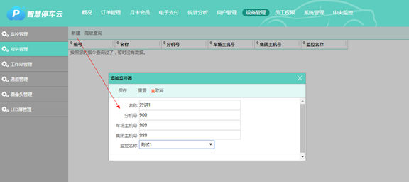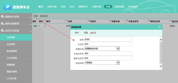 在車場和集團的設(shè)備管理模塊,可以添加對講,輸入對講的名稱、分機號、對應(yīng)主機號、對應(yīng)監(jiān)控等信息,分機號和主機號由泊鏈分配。添加對講時,可綁定指定的監(jiān)控,當(dāng)車主呼叫中控室時該監(jiān)控會放大顯示當(dāng)前畫面。