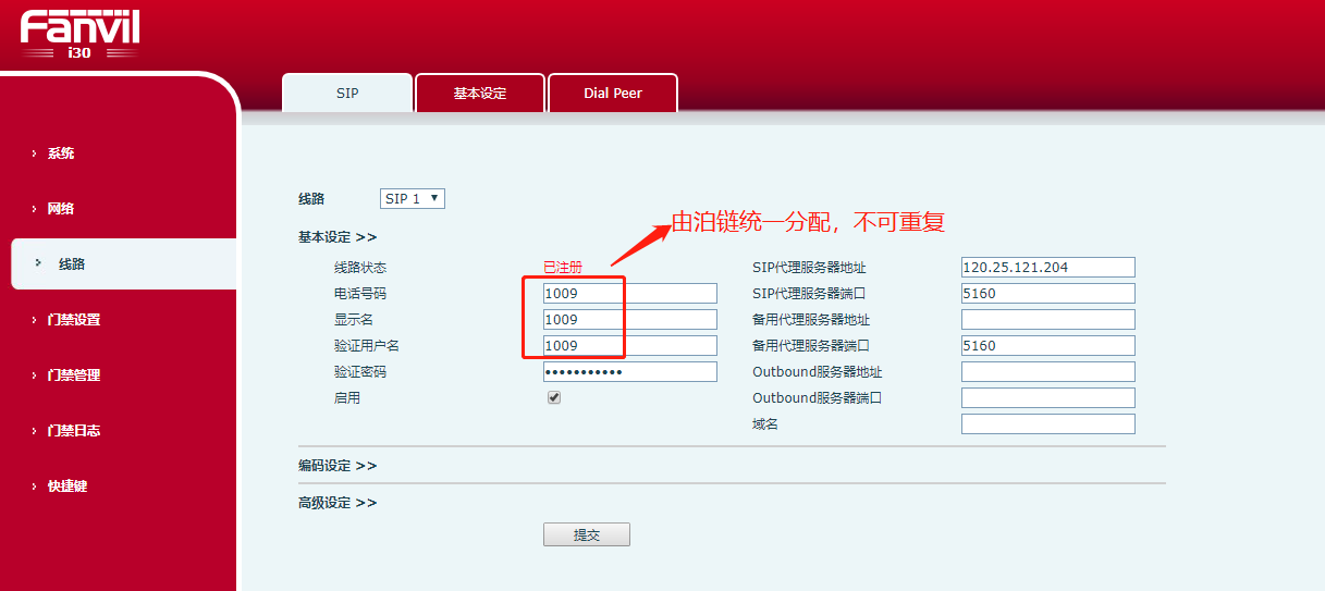 (2)線路模塊可修改當(dāng)前對講設(shè)備的電話號碼,輸入泊鏈統(tǒng)一分配的對講賬號,驗證密碼統(tǒng)一為17701081721,其他參數(shù)按圖中填寫即可。